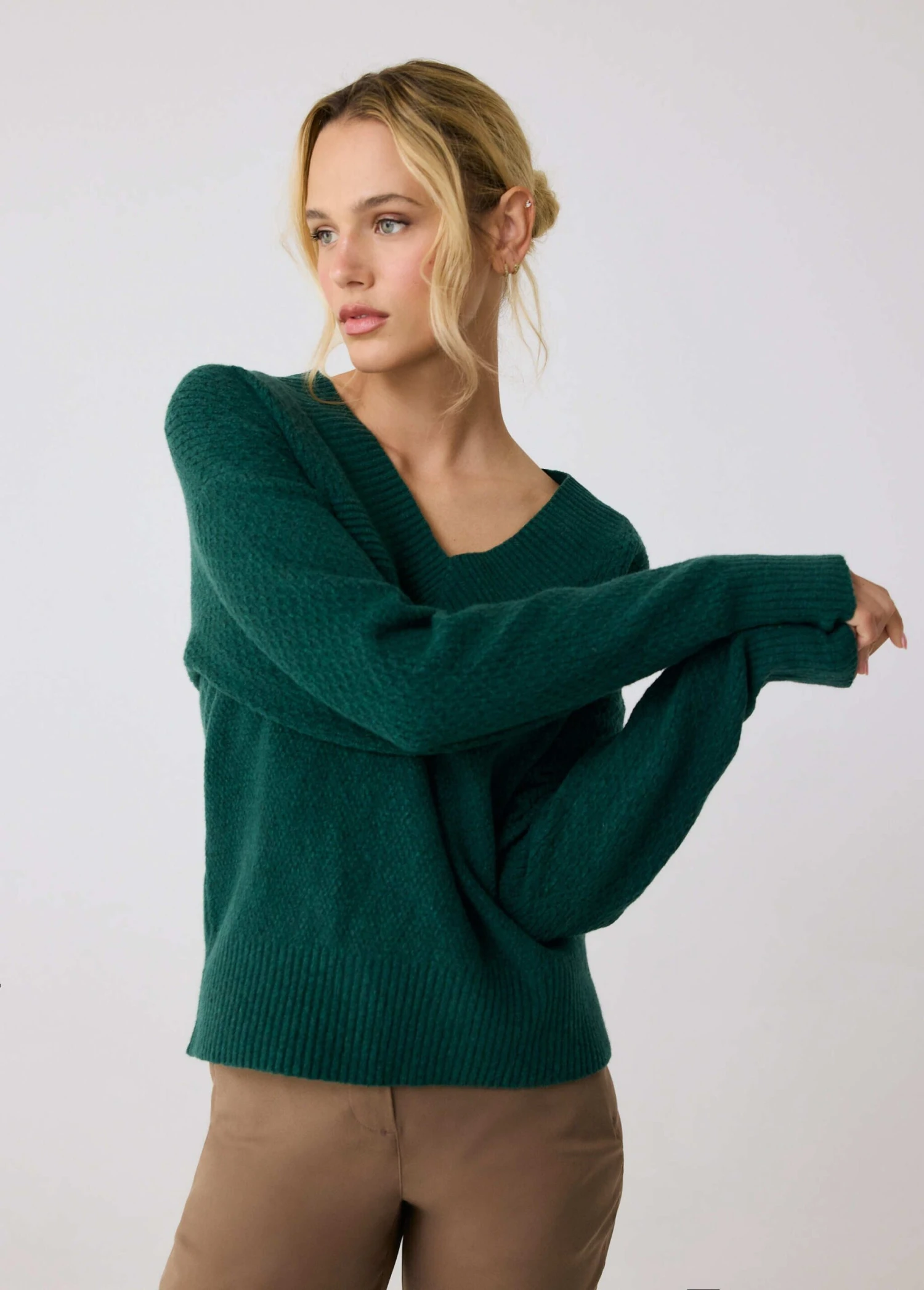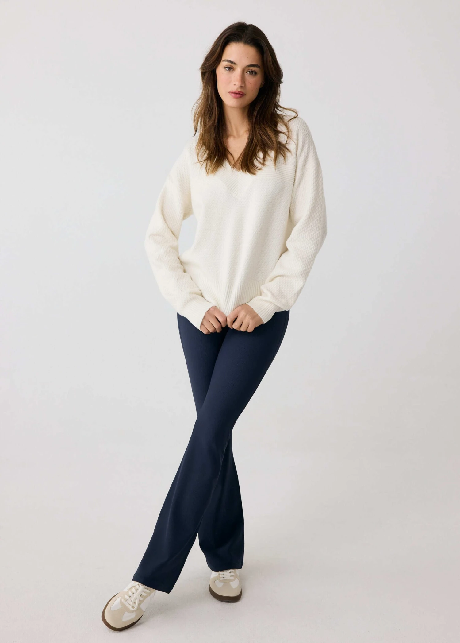 The Camille vneck sweater is designed for comfy and stylish moments. The relaxed fit sweater falls just above the hips and has contrast tipping at the front neckline .