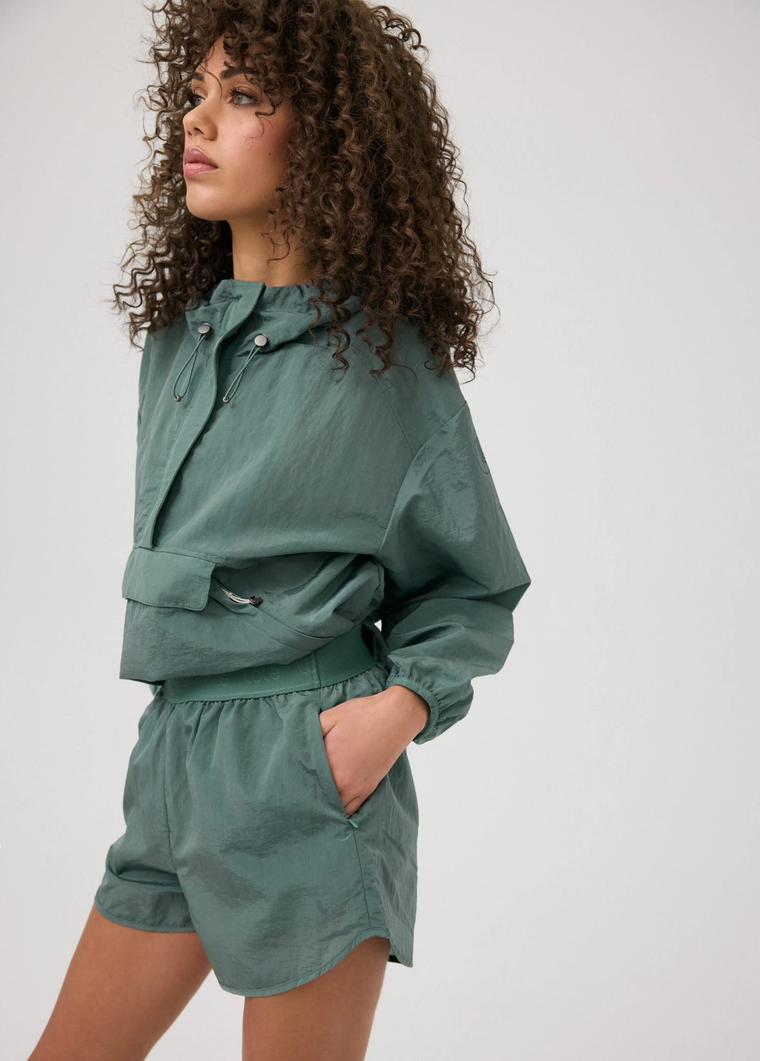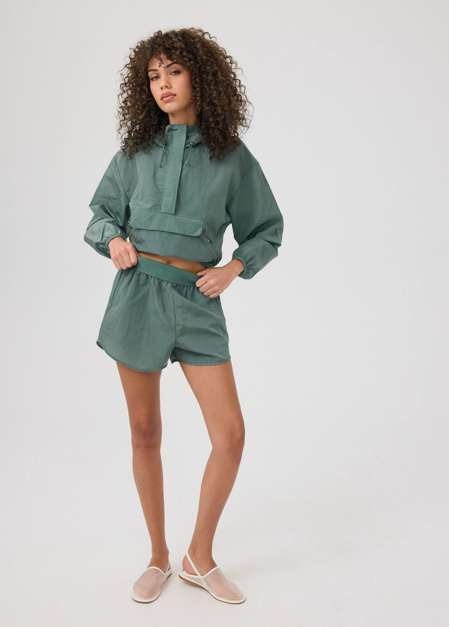 The sleek nylon anorak shorts, crafted for both style and functionality. With its water-resistant exterior and versatile design, it’s the perfect ensemble to take from lunch date to hot girl walks.